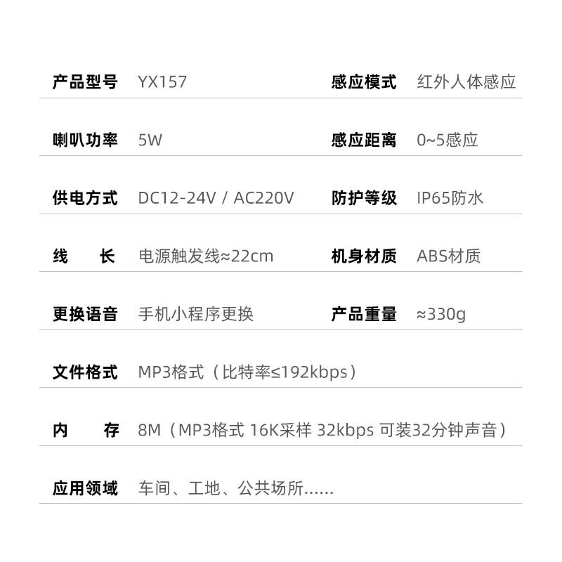 YX157ÈËÌå¸ÐÓ¦Îü¶¥ÌáÐÑÆ÷ÊÇѡȡ±ØÓ®ÑÇÖÞµç×ÓÖÇÄÜMP3ÒôÀÖ²¥·ÅоƬΪ´¦ÖÃÖ÷Ì⣬FLASHоƬΪ´æ´¢Æ÷¿ª·¢µÄÓïÒô²¥·ÅÆ÷²Ä¡£Ëü¿ÉÓÃÓÚµçÁ¦ÏµÍ³·¢µç³§¡¢¾üʹÜÔì¡¢¹«°²½è¼øÇø¡¢Ïû·Àͨ·¡¢½»Ò×ÌüÍøµã£¬µçÌÝ£¬×Ô¶¯·öÌÝºÍÆäËü±ØÒªÌáÐÑÓйØÈËÔ±°ÑÎȵݲȫ·À±¸ÇøÓò£¬»òÕßÓ½Ó¿ÍÈ˵½À´µÄÓïÒôÌáÐÑ¡£µ¹Øì̽Æ÷̽²âµ½ÓÐÈ˽øÈë¸ÃÇøÓòʱ£¬»á×Ô¶¯¸ÐÓ¦²¥±¨ÓïÒôÐÅÏ¢